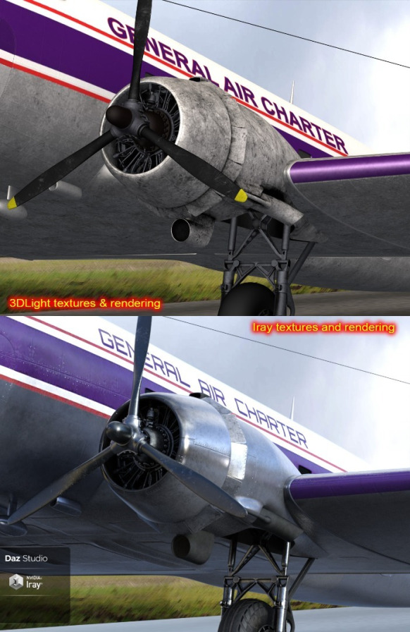 Notice that the render of the DC3 "Steel Bird" in this page and the picture of the Home page showing the Toon Private Plane" are coated with one of the new Iray Textures they get and rendered in DS Iray.